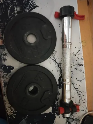 Juego de pesas con discos para entrenamiento en casa. El mango es de color rojo y los discos son negros. - Mango con agarre antideslizante. - Discos de peso. - Cierres de rosca para asegurar los discos. Varios discos aparte (2€/disco)