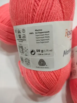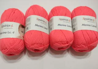 Lote de 4 ovillos de lana Rosarios 4, modelo Merino Land. - Color: Coral. - Material: 100% Lana Merino. - Peso por ovillo: 50 g (1.75 oz). - Longitud por ovillo: 220 metros.