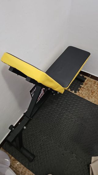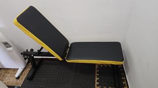 Banco de ejercicios ajustable en buen estado. - Tapicería amarilla y negra. - Estructura metálica negra.