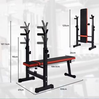 Banco de pesas multifuncional para entrenamientos en casa. - Estructura robusta de acero. - Acolchado cómodo para mayor soporte. - Diseño plegable para fácil almacenamiento.