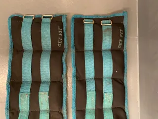 Par de pesas ajustables para tobillos o muñecas, ideales para complementar tu rutina de ejercicios. 4 en total - Color negro con ribete azul. - Cierre de velcro para un ajuste seguro. - Relleno interno para añadir peso.