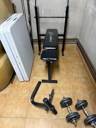 Hola! Estoy de mudanza y vendo algunas cosillas que prefiero no llevarme :) echa un ojo al resto de anuncios! Banco de pesas con estructura metálica y acolchado en naranja y negro. - Asiento y respaldo acolchados. - Soporte para piernas. - Diseño ajustable. - Tiras elásticas con mangos. - Manual de montaje incluido. Si lo pillas con las mancuernas ajustables de la última foto (ver anuncio), el pack te lo dejo a 200€ :).