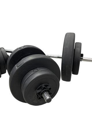 Set de pesas ajustables con un peso total de 19kg. Se encuentran en perfecto estado. - Incluye barras y discos. - Cierres de seguridad incluidos.