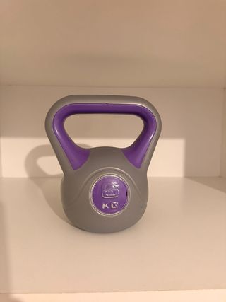 Pesa rusa de 6 kg, ideal para entrenamientos. - Color gris con detalles en morado. - Marcaje de peso visible en la base.