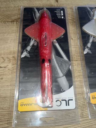Señuelos JLC PACK DE 4 señuelos 2 sepias blanco destellos rosas. 1 calamar completo con tentaculos y asist. Color rojo brillos y tentaculos blanco perla. 1 calamar completo con tentaculos y asist. Color blanco destellos rosas y tentaculos rojo brillos. Peso 150 GR Vendo por acumulación de señuelos PRECIO DEL PACK NUEVO 98€ Precio 80 todo el pack