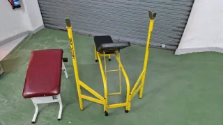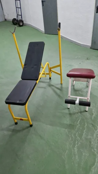 Banco de pesas Cups ideal para realizar press de banca y otros ejercicios. Está en buen estado - Incluye banco de pesas con soporte para barra. - Se incluyen ocho pesas