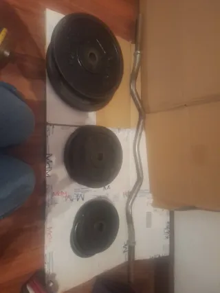 barras de gimnasio y pesas 1 barra larga de 155 - 28 mm 1 barra tríceps romana - 28 mm 1 barra 120 cm - 30 mm 10 discos de 1 kg 6 discos de 2 kg