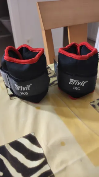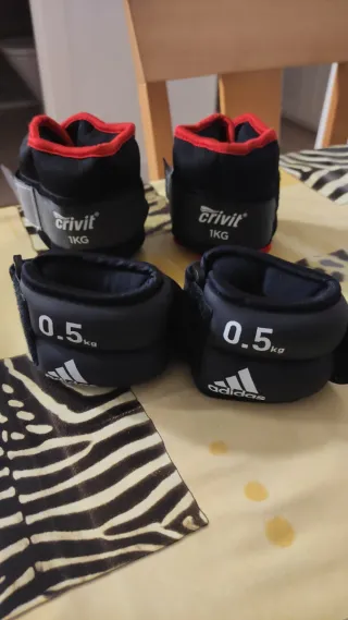 Conjunto de muñequeras de peso para entrenamiento. - Dos muñequeras Crivit de 1 kg cada una. - Dos muñequeras Adidas de 0.5 kg cada una. - Cierre ajustable de velcro.