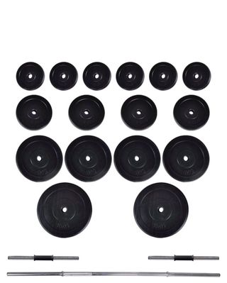 Kit de pesas de la marca Decathlon con un peso total de 20kg. Incluye barras y discos para entrenar en casa. - Dos barras cortas para mancuernas. - Cuatro discos de 1kg. - Cuatro discos de 4.4 lbs (aproximadamente 2kg cada uno). - Dos cierres de seguridad para las barras.