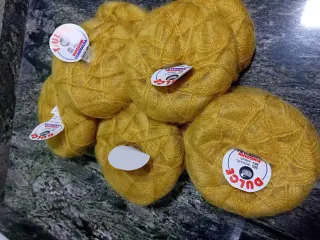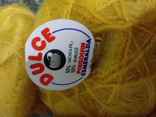 Lote de ovillos de lana de color amarillo ocre, ideales para tus proyectos de tejido. - Material: 50% Mohair, 50% Acrílico. - Marca: Dulce Pingouin Esmeralda. - Peso por ovillo: 50 g. #Si se compra el ovillo gigante de mi perfil y si es para envio, el precio total de todo sería de 19 €.#