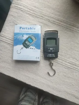 Báscula electrónica portátil, ideal para pesar equipaje o paquetes. - Pantalla digital. - Gancho de acero inoxidable. - Diseño compacto y ligero. Usada una sola vez.
