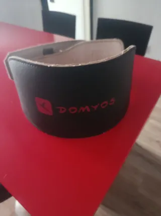 Cinturón de pesas de la marca Domyos, diseñado para ofrecer soporte durante el entrenamiento. - Color negro con logo rojo. - Material resistente.