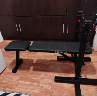 Banco de pesas marca CORENGTH, ideal para entrenamientos en casa. - Estructura metálica resistente. - Diseño plegable para fácil almacenamiento. - Tapicería acolchada para mayor comodidad.