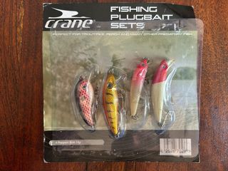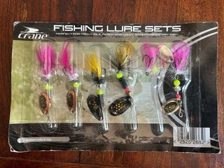 Tres sets accesorios de pesca. El precio para todo el lote es de 10E. Lote compuesto por: - Set de señuelos de pesca de la marca crane, incluye 4 señuelos tipo popper. - Set de señuelos giratorios de la marca crane, (spinner Lures) Peso del lote 240 Gr. REF-CADEME