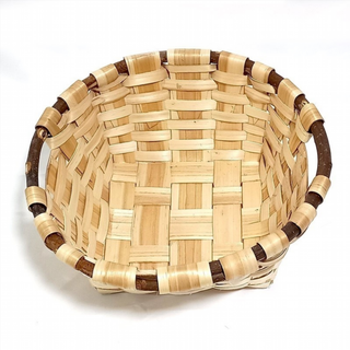 La Cesta de mimbre con tapas 03 es perfecta para recolectar setas o como elemento decorativo. Su diseño tricolor y asa reforzada la hacen única y práctica. Dimensiones: 37x24 cm Peso: 850 gr Capacidad: 4-6 kg Mimbre buff con decoración natural y negra