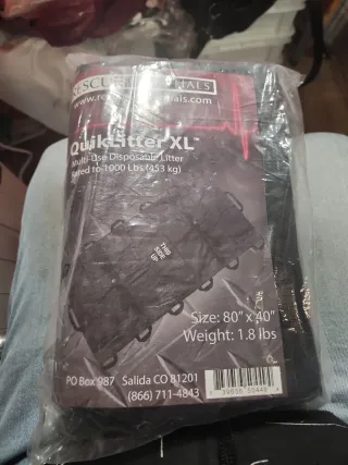 Lona de evacuación multiusos QuikLitter XL. - Capacidad de carga de hasta 453 kg (1000 lbs). - Tamaño: 80 x 40. - Peso: 1.8 lbs. - Fabricada por Rescue Essentials.