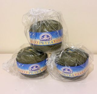 Lote de 3 ovillos de perlé Petra de Dmc. Son del grosor 8, para agujas de 2mm y ganchillo de entre 1 y 1,25 mm. Son del color 53011 (verde oliva). Cada ovillo pesa 100g y tiene 800m. Compuesto por 100% algodón. Los 3 ovillos nuevos sin empezar y del mismo lote. No negociable