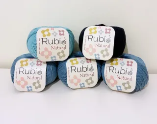 Lote de 5 ovillos Rubi Natural. 3 del color 013 (2 lotes distintos), 1 del color 011 (turquesa) y otro del color 014 (azul marino) Todos los ovillos nuevos sin usar. Cada ovillo pesa 50g y tiene unos 155m. Compuesto por 100% algodón. Para agujas de tricot de 2,5 a 3,5 mm y ganchillo de 3 mm. No negociable.
