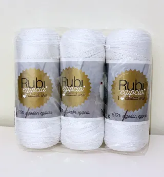 Lote de 3 zepelines de perle Rubi egipcio color blanco. Son del número 8, para aguja de ganchillo de 2 mm. Cada zepelin pesa 100g y tiene unos 600 m. Los 3 zepelines nuevos sin empezar y del mismo lote. Compuesto por 100% algodón egipcio mercerizado, peinado y gaseado. Algodón de primera calidad. No negociable.