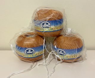 Lote de 3 ovillos de perlé Petra de Dmc. Son del grosor 8, para agujas de 2mm y ganchillo de entre 1 y 1,25 mm. Son del color 5436 (marrón claro). Cada ovillo pesa 100g y tiene 800m. Compuesto por 100% algodón. Los 3 ovillos nuevos sin empezar y del mismo lote. No negociable