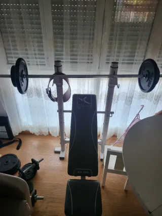 Banco de pesas con barra y discos ,4 discos de 5 kilos, 2 discos de 10, 8 discos de 2 kilos, 4 de 1 kilo, mas barra larga