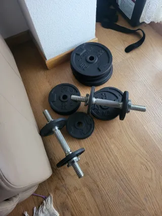 Conjunto de discos de pesas para gimnasio, ideales para complementar tu entrenamiento. - 8 discos de 2 kg (vendidas) - 12 discos de 1 kg a 1€ - Marca: DOMYOS.