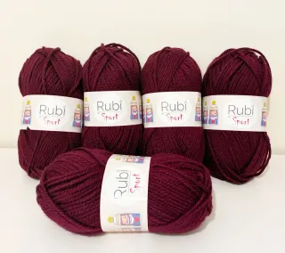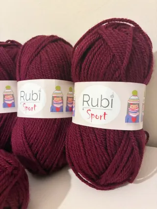 5 madejas de lana Rubi Sport. Todas del mismo color (077) y lote. Cada madeja pesa 100g y tiene unos 133m. Compuesta por 100% lana acrílica. Para agujas de tricot de 7 mm y ganchillo de 5 mm. Las 5 madejas nuevas sin empezar. No negociable.