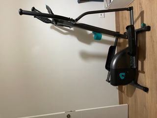 Bicicleta elíptica Decatlhon con rueda de inercia de 6 Kg, longitud de zancada de 33 cm. Incluye 5 funciones: calorías quemadas, distancia recorrida, tiempo de entrenamiento, velocidad y frecuencia cardíaca a través de los sensores situados en el manillar. 7 programas integrados, elaborados en colaboración con nuestros entrenadores, para acompañarte en tus entrenamientos. Practicamente nueva, muy fácil de transportar y montar, no ocupa demasiado. Ruedas en su parte delantera para moverla con mayor facilidad. Peso del producto 34 kg Peso máximo del usuario: 100 kg.