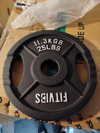 Se venden dos discos de pesas de la marca Fitvids. - Cada disco pesa 11.3 kg (25 lbs). - Fabricados en hierro fundido. - Diseño con asas para facilitar el agarre.