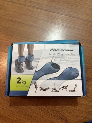 Pesas tobilleras de la marca Pro-Form, ideales para añadir definición a tu rutina de ejercicios. - Peso total: 2 kg. - Incluye 2 pesas de 1 kg cada una. - Diseño tipo wrap para tobillos.