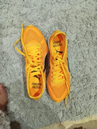 Zapatillas de atletismo con clavos Puma Evo speed Haraka 8 en color naranja. Talla: 38.5. Precio original: 80€, estado NUEVAS sin estrenar, se venden porque no me valen y he tirado la caja. Ultrarrápida y probada en la pista. Despega a toda velocidad con la malla transpirable y la entresuela de EVA. Los clavos intercambiables proporcionan un agarre inigualable en cualquier superficie. Diseñada para brindar estabilidad y sujeción, el armazón de ante en el interior y el ajuste similar al de un calcetín mantienen el pie en su sitio. Da rienda suelta a tu potencial para batir récords. - Ajuste estándar - Empeine de malla - Peso: 204 g