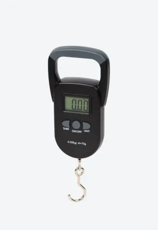 Balanza digital portátil con asa y gancho para pesar equipaje o paquetes. - Pantalla LCD. - Botones TARE, ON/OFF, UNIT. - Rango de pesaje: 0-50kg. - Precisión: 10g.