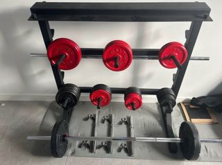 Conjunto de equipamiento para entrenamiento de fuerza. - Rack de pesas negro. - Discos de pesas rojos y negros. - Barra de pesas. Recogida en Illescas