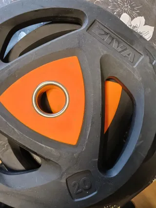 Se venden discos de pesa ZIVA de 20kg. - Color negro con detalles naranjas. - Diseño con agarres para facilitar su manejo. - Anillo central metálico.