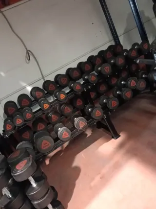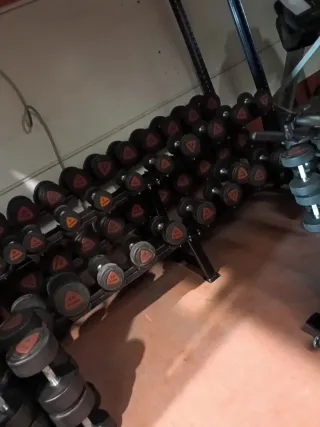 Se vende lote de mancuernas de gimnasio con pesos variados. - Mancuernas de diferentes pesos. - Ideales para entrenamiento de fuerza. - Estructura robusta.