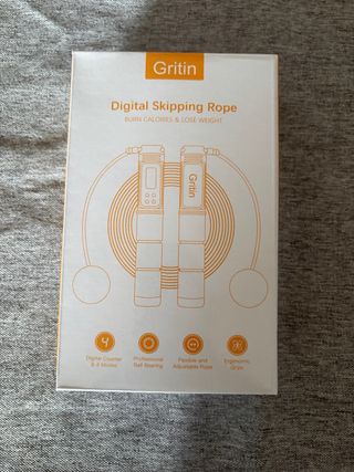 Comba digital de la marca Gritin, ideal para quemar calorías y perder peso. Diseñada para un entrenamiento efectivo. - Contador digital con 4 modos. - Rodamiento profesional de bolas. - Cuerda flexible y ajustable. - Mangos ergonómicos. Sin usar