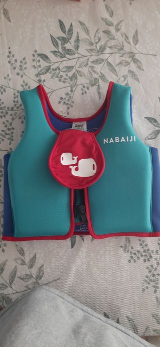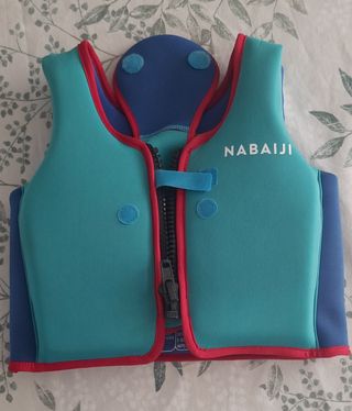 Chaleco salvavidas infantil Nabaiji, prácticamente nuevo. Ideal para que los más pequeños disfruten del agua con seguridad. Talla M hasta 105 cms altura, 30 kg peso, 60 cms contorno. Un par de usos. - Marca: Nabaiji - Color: turquesa y rojo - Diseño: con bolsillo frontal - Talla:medidas en la etiqueta (ver foto) ya descritas.