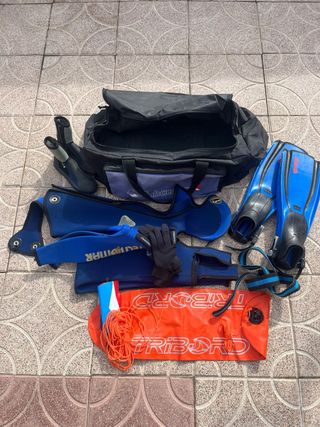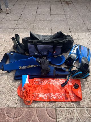 Conjunto de equipo de buceo listo para usar. - Traje de neopreno azul. - Botas de buceo. - Aletas de buceo azules. - Guantes negros. - Boya de señalización naranja. - Cuerda naranja. - Bolsa de transporte negra y azul. escarpines 41-42 bolsa 100 L guantes M traje M L 40-42 aletas 36-45 flotador triboard pesas 4 x 2 Kg + 1 X 1kg ESCARPINES Y PESAS CON CINTURON YA VENDIDOS