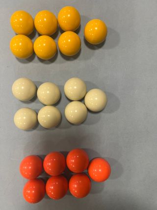 Set de 21 bolas para futbolín. Son pesadas y de color amarillo, blanco y naranja. - 7 Bolas de color amarillo. - 7 Bolas de color blanco. - 7 Bolas de color naranja. - Máxima durabilidad y control del juego. - Estas bolas de futbolín son las que se usan en los campeonatos. - Peso: 36 gramos. - Diamatro 34 mm - Material: Baquelita. - Precio: 1,50€ unidad. - Este producto nunca se ha usado.