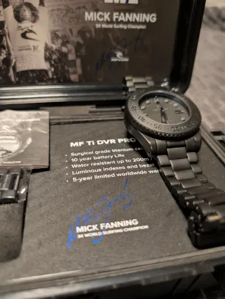 Rip Curl MF Ti DVR PRO – Edición Especial Mick Fanning (Titanio) Movimiento Japan Pongo a la venta este exclusivo reloj Rip Curl, modelo personal de la leyenda del surf Mick Fanning. Es una pieza de ingeniería diseñada para durar toda la vida. 📏 Especificaciones de Talla y Ajuste: Diámetro de la caja: 44 mm ). Material: Titanio 100% (Extremadamente ligero a pesar de su tamaño y totalmente hipoalergénico). Correa: Armis de titanio con cierre de seguridad doble. Ajuste: Incluye eslabones adicionales para adaptarse a cualquier tamaño de muñeca