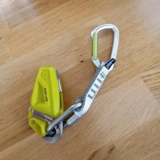 Asegurador Edelrid Ohm para escalada. Para solucionar la diferencia de pesos entre compañeros de escalada. He cambiado la cinta por una de singing rock con año de fabricación del 2025. Cómo puedes ver en las fotos ha tenido muy poco uso (en rocódromo) Actualmente han sacado la nueva versión mejorada, pero vamos este modelo cumple con su función.