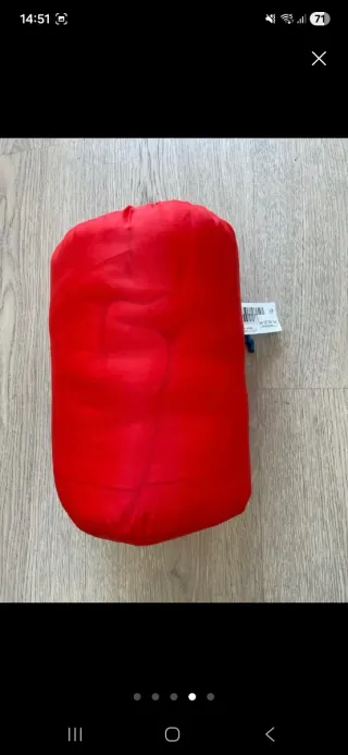 Saco de dormir Quechua para niños, modelo Junior, con una temperatura de confort de 10°C. Le faltan 4 puntadas de hilo en el lado derecho. Añado foto donde se aprecia. Es únicamente hilo decorativo. - Color: Rojo - Peso: 790g (1 lbs 12 oz) - Dimensiones: 165 cm de largo, 65 cm de ancho - Altura máxima del usuario: 140 cm - Apto para temperaturas de hasta 10°C - Incluye bolsa de transporte - Marca: Quechua