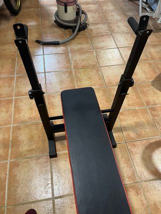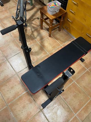 Banco de pesas y abdominales con diseño inclinable y plegable. Ideal para entrenar en casa. - Tapicería acolchada en rojo y negro. - Estructura metálica robusta. - Reposapiés acolchados para mayor comodidad.