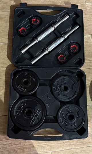 Discos de pesas usados para entrenamiento de fuerza. Ideales para añadir resistencia a tus ejercicios. - 2 Discos de caucho 5 kg 30 euros - 6 Discos de 1 Kg de hierro fundido 12 euros - Barra 1,40m 25 euros - Se encuentran en buen estado, con señales normales de uso. - Perfectos para principiantes o para complementar tu equipo actual.
