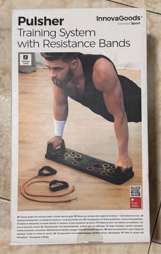 Nuevo en su caja sin abrir. Tabla de flexiones con bandas de resistencia de InnovaGoodss Sport Fitness. Este sistema de entrenamiento cuenta con todo lo necesario para tonificar y fortalecer los músculos en casa o para llevarla al gimnasio. Material: ABS, PP y Goma Adhesivos antideslizantes: X20 Asas de agarre extraíbles para tabla de ejercicios: x2 Bandas elásticas de resistencia: x2 Peso máx. soportado: 100 kg Incluye: Guía de ejercicios y manual en 24 idiomas Medidas aprox.: 67 x 19 x 2 cm Gastos de envío aparte.