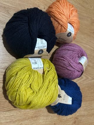 Ovillos de lana y algodón, perfectos para tejer tus proyectos de otoño. Son cinco ovillos en tonos cálidos. - Cada ovillo pesa 50g (1.76 oz) y tiene aprox. 170m (186 yds). - Colores: Amarillo mostaza, azul marino, naranja, malva y negro. - Ideales para agujas de 3-3.5 mm (US 3-4, UK 9). - Son ovillos nuevos, sin usar. Recogida en mano en mesa y lopez