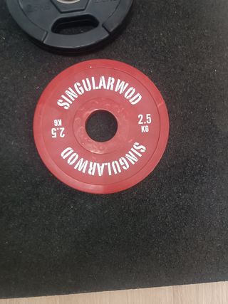 Dos discos de peso de 2.5kg para entrenamiento de fuerza. como nuevod - Marca: AFW y Singular Wood - Material: goma - Peso: 2 de 10 kilos 2 de 5 kilos 2 de 2,5 kilos marca AFW 2 de 2,5 kilos marca singular wod, estos algo más desgastados pero en perfecto estado de uso Precios 10 kilos : 40 euros unidad 5 kilos : 30 euros unidad 2,5 kilos AFW: 15 euros unidad 2,5 kilos Singularwod: 15 euros unidad