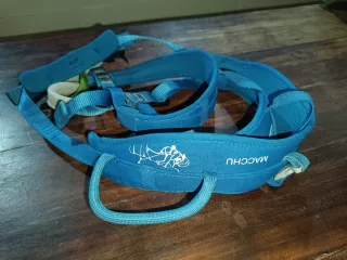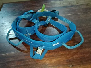 Arnés de seguridad para niños de la marca Petzl, diseñado para un peso máximo de 40 kg. Es de color azul y cuenta con hebillas ajustables. - Color azul. - Cierre con hebillas. - Marca: Petzl.