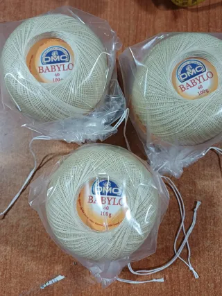 Se venden tres ovillos de hilo DMC Babylo. - Color: Crudo. - Grosor: N40. - Peso: 100g cada ovillo. - Material: Algodón.