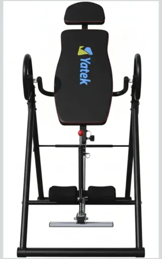 Mesa de inversión Yatek ECO en color negro. Diseñada para el bienestar y la relajación. - Tapicería acolchada para mayor comodidad. - Estructura robusta y estable. - Logo de Yatek visible en el respaldo. - Peso máximo de 150kg.